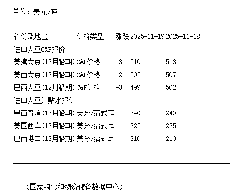 11月19日進口大豆到國內(nèi)港口C&F及升貼水報價