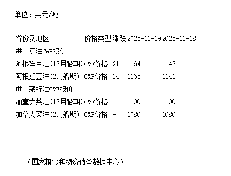 11月19日進口阿根廷豆油及加拿大菜籽油C&F報價